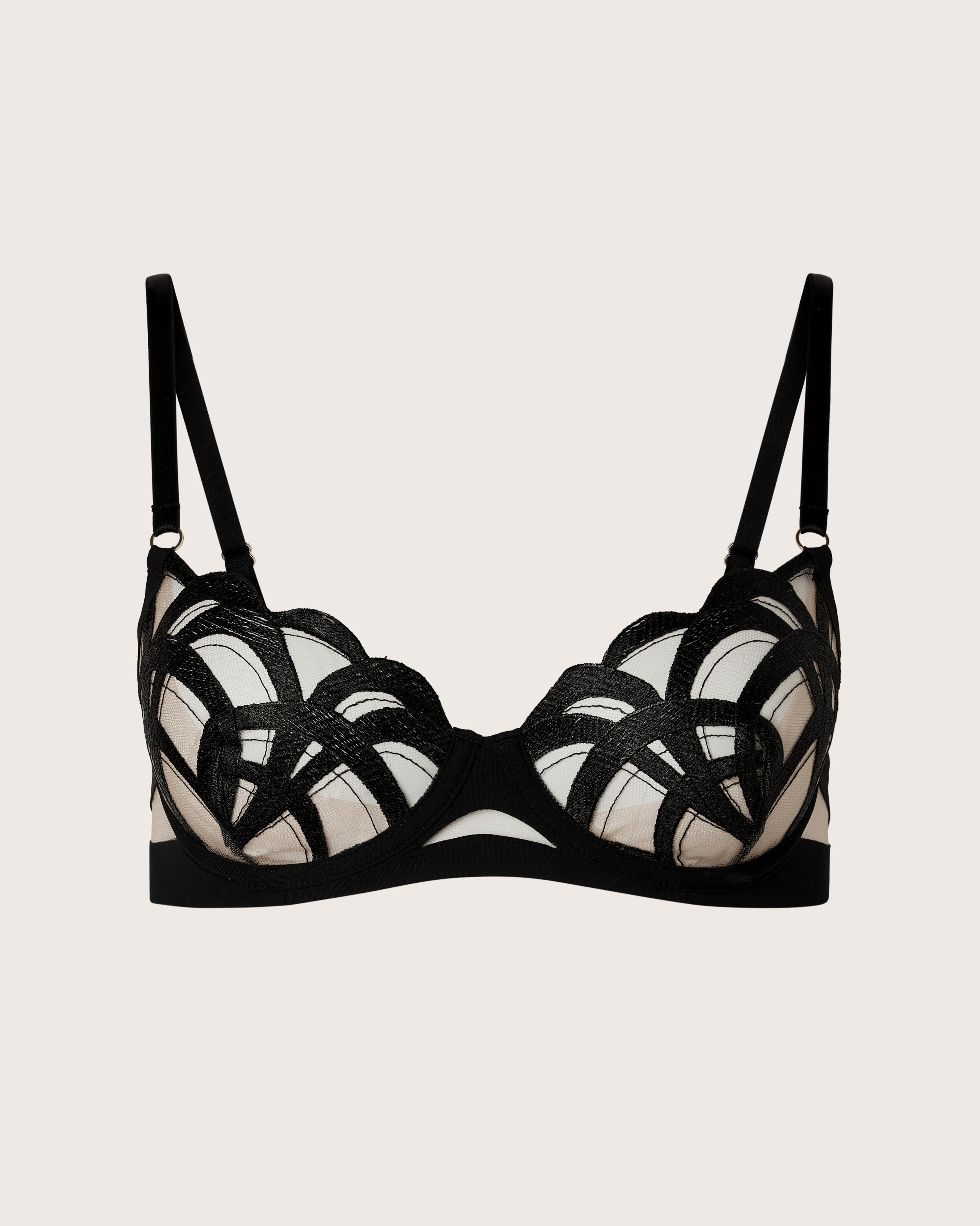 Contemporary architectural embroidery over sheer tulle with unlined cups, for unapologetic charm.