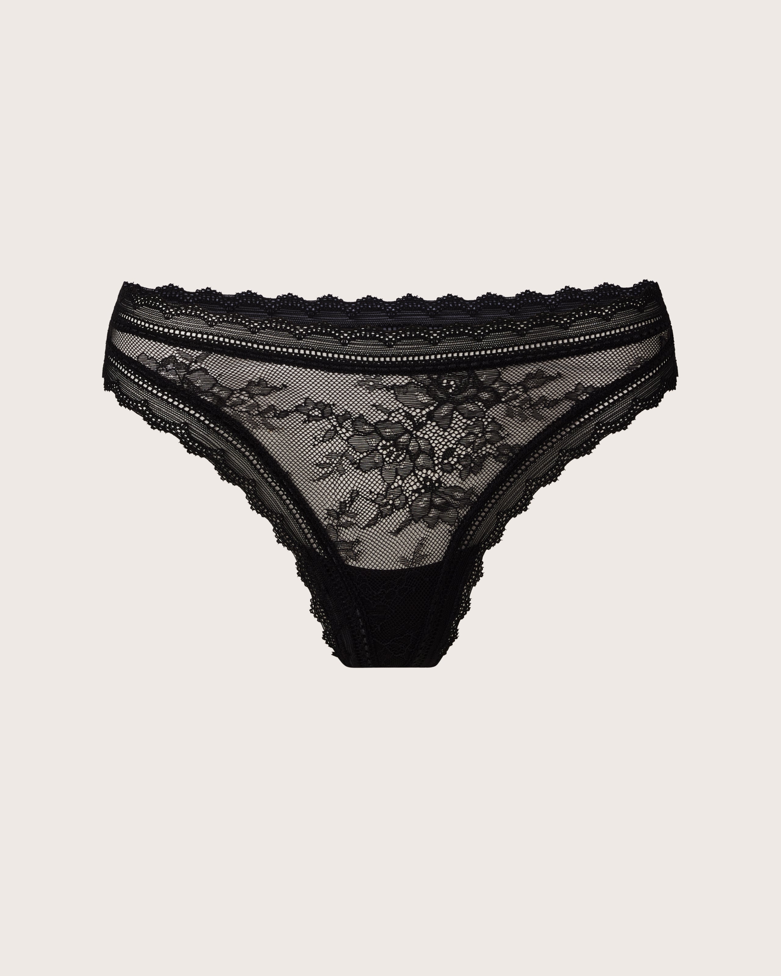 Floral stretch lace, with elastic-free edges for a seamless silhouette. A classic thong with a breathable, bamboo blend liner effortless comfort.