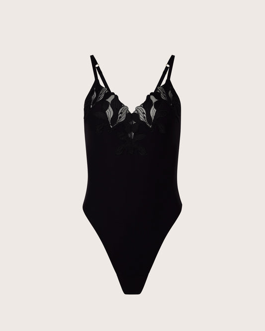Stretch-microfibre melts around your silhouette, adorned with satin embroidery and cheeky charm.