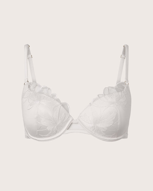 Indulgent satin detailing. Statement floral embroidery. Naked mesh. A full, voluminous boost.