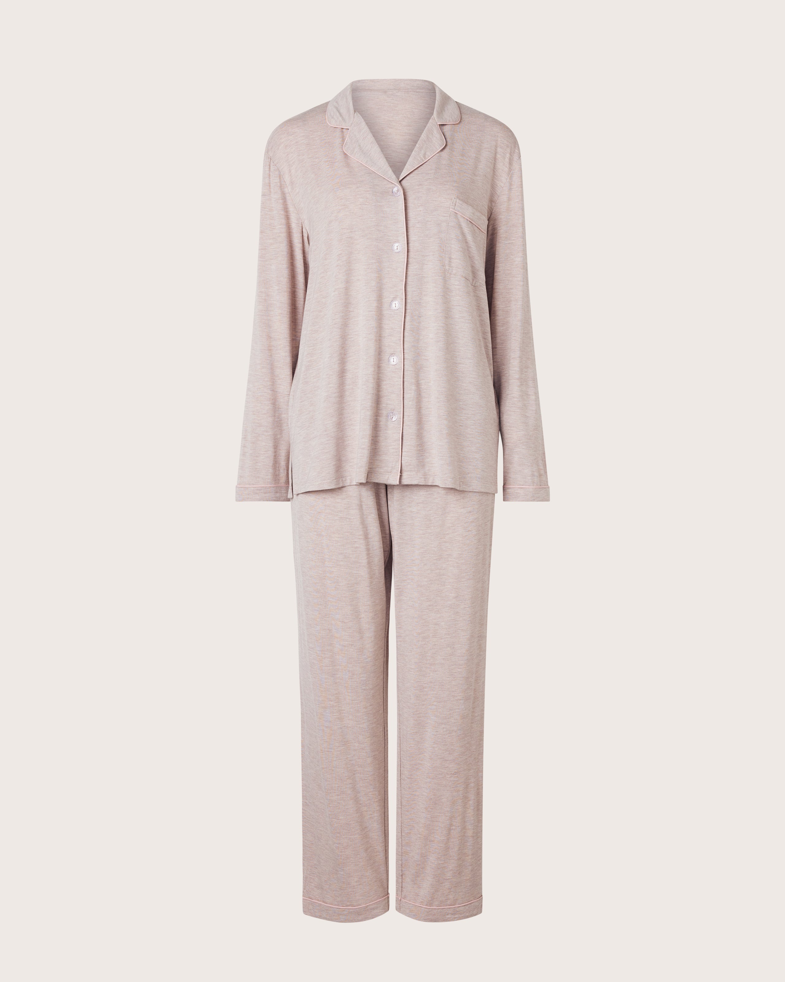 Empowered comfort that works overtime. Think elevated lounging with a breathable, bamboo-blend, contrast piping and a tapered, straight pant.