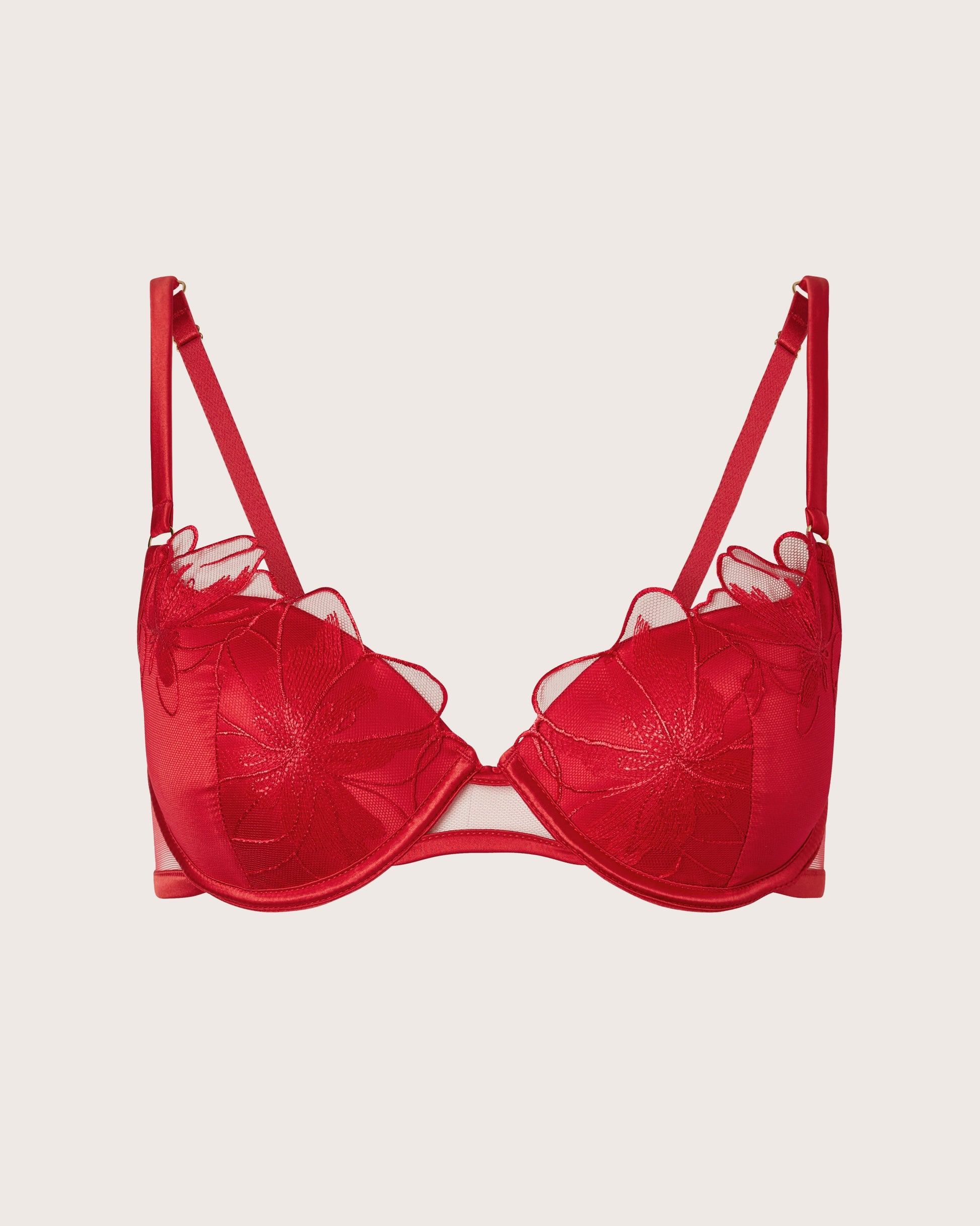 Indulgent satin detailing. Statement floral embroidery. Naked mesh. A full, voluminous boost.